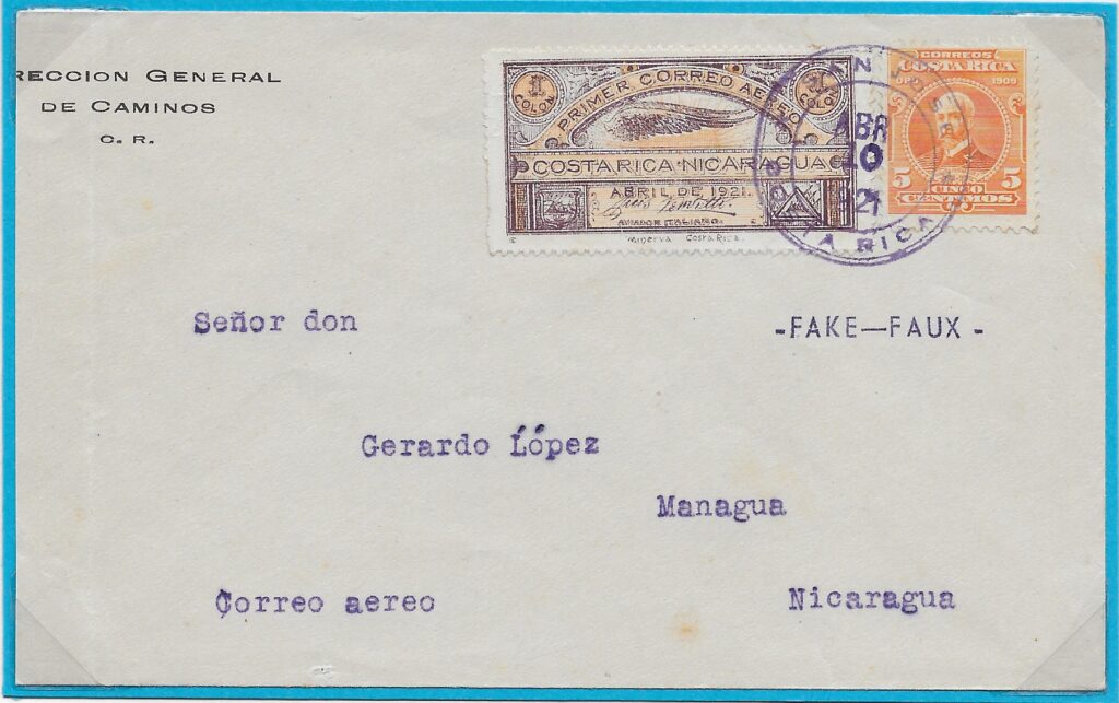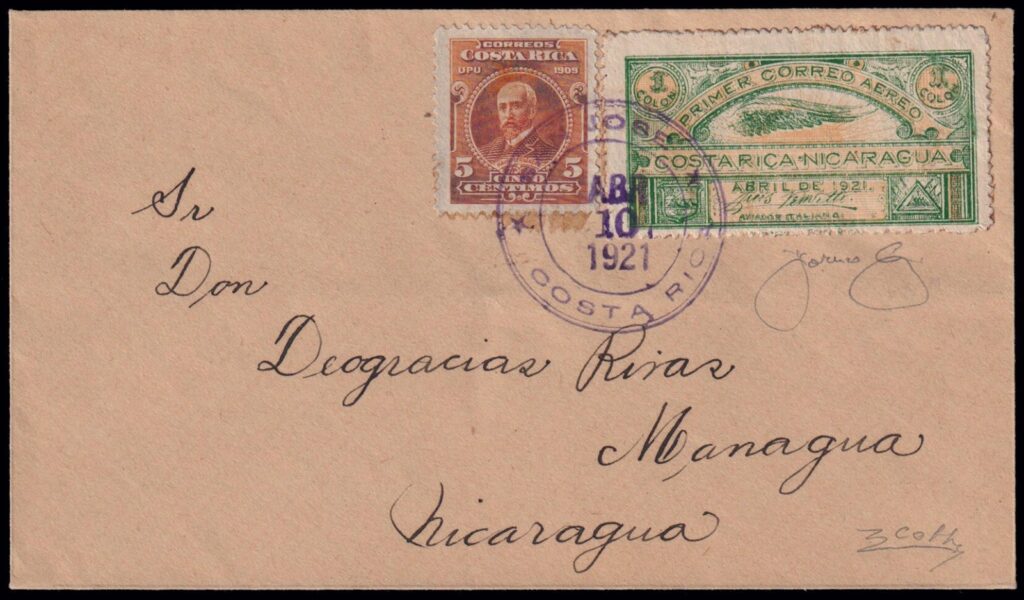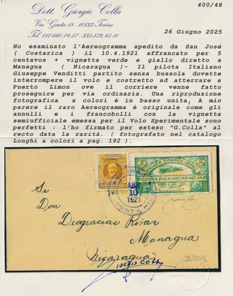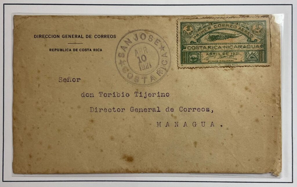 El especialista Stanley R. Rice publicó en Aero Philatelist Annals (julio de 1955) el análisis de este sobre enviado por Antolín Chinchilla —autor del grabado de la sobretasa— al Jefe de Investigación en Managua, Eduardo Echeverrí. El sobre, franqueado con la estampilla de 5 centavos de 1910 (Scott 72) y cancelado en San José el 10 de abril de 1921, incluye, además, la sobretasa verde de Venditti, sin cancelación costarricense, pero matasellada a su llegada a Nicaragua.